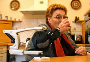 - amplitude des gestes limités (par exemple porter le couvert ou le verre à la bouche...)