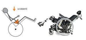 - la bascule d’assise permet, entre autres, d’améliorer la stabilité du bassin, afin de limiter le phénomène de glissement des fesses vers l’avant de l’assise qui pourrait entraîner un positionnement enroulé qui favoriserait la chute de la tête vers l’avant. Il existe aussi d’autres raisons pouvant entraîner la rétroversion du bassin (profondeur trop importante, cale-pieds mal réglés…).